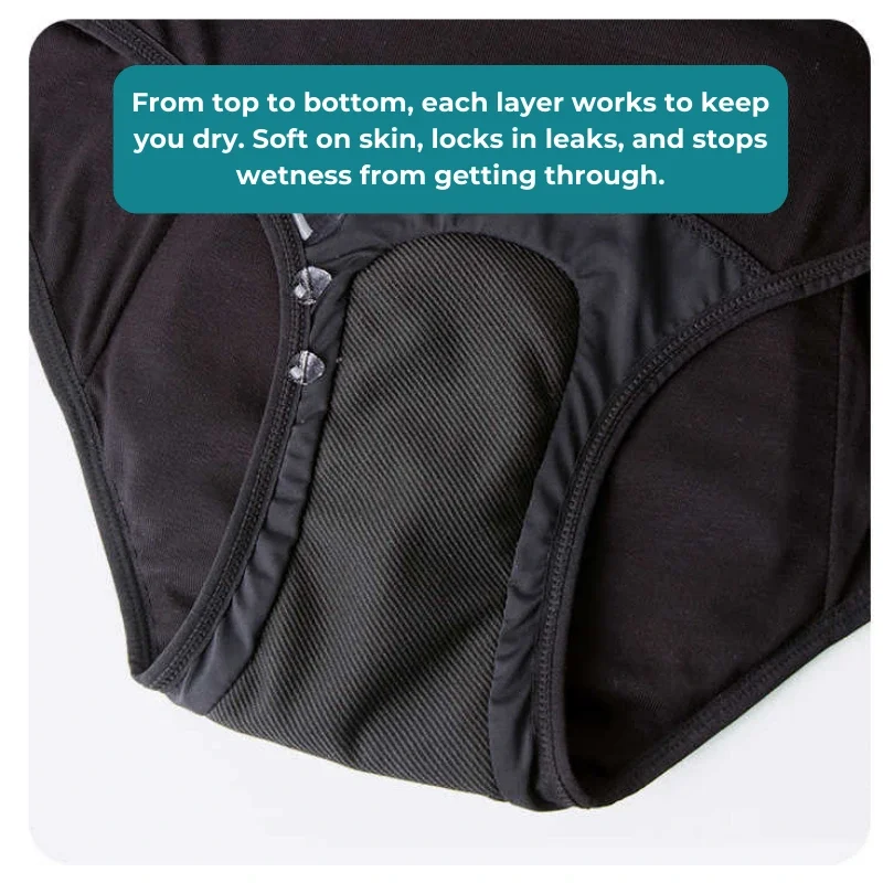 The third waterproof layer makes sure nothing leaks through, and the comfortable outer layer feels just like regular underwear.
